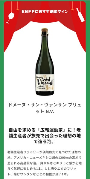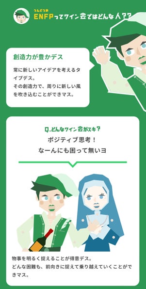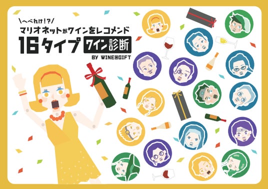 16タイプワイン診断は、性格診断結果に基づいてぴったりのワインを提案するだけでなく、ユニークなキャラクターがワインの楽しみ方を教えてくれる、エンターテイメント要素満載のサービスです。