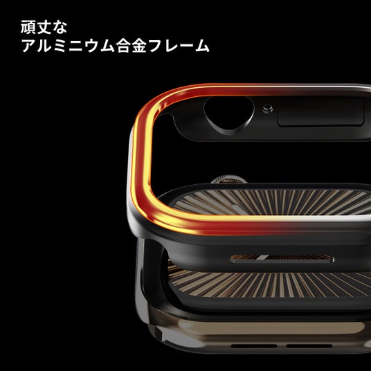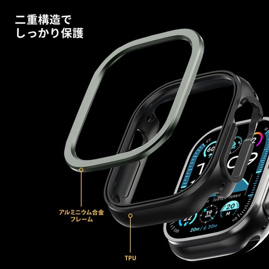 柔軟なTPUカバーがApple Watchを優しく包み込み、その上に頑丈なアルミニウム合金フレームで覆うことで、衝撃からしっかりと守ります。