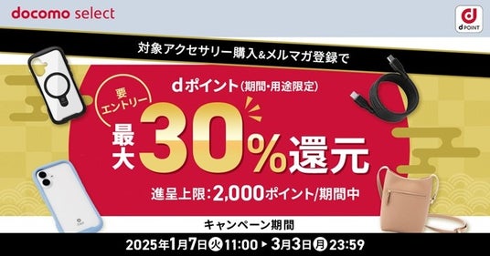 株式会社NTTドコモ(以下、ドコモ)は、「docomo select」メールマガジンにご登録のうえ、ドコモオンラインショップにて対象商品をご購入いただいたお客さまを対象に、合計購入金額(税込)の最大30%のdポイント(期間・用途限定)を進呈する「対象アクセサリー購入で最大30%ポイント還元キャンペーン」(以下、本キャンペーン)を2025年1月7日(火)から2025年3月3日(月)までの期間で開催いたします。