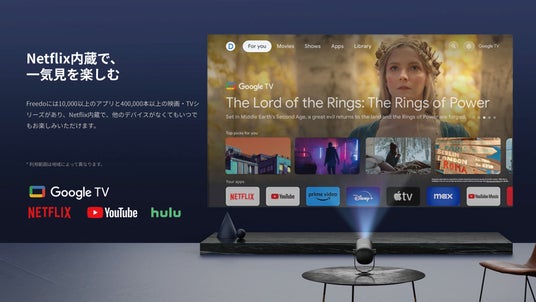 Dangbei Freedoは、Google TVを内蔵しており、豊富なエンターテイメントコンテンツを楽しむことができます。40万本以上の映画やテレビ番組に加え、日本の人気サービスであるABEMAやTVerなども利用可能です。Netflix、Prime Videoなどの正規アプリが搭載されているほか、Disney+、Huluといった人気アプリもダウンロードできるため、場所を選ばず多彩なコンテンツを楽しめます。Google TVには1万本以上のアプリが用意されており、スポーツ、フィットネス、音楽、ゲームなど幅広いジャンルをカバーしています。Google Castを使えば、スマートフォンやタブレットから簡単に画面を投影できるほか、Google アシスタントによる音声コントロールにも対応しているため、再生や音量調整などの操作が声だけで行えます。