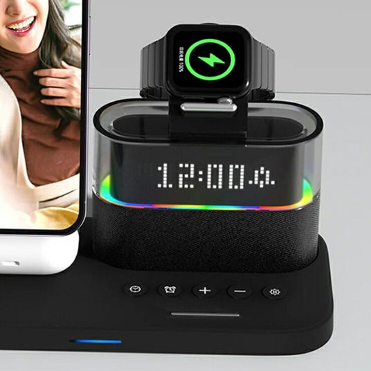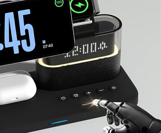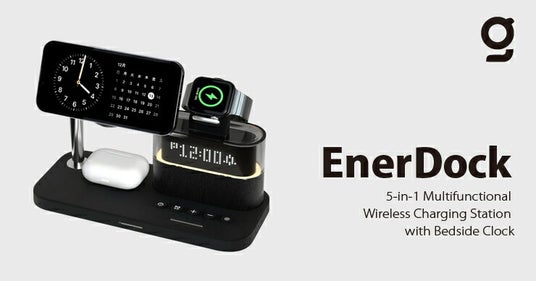 EnerDockはスマートフォン、スマートウォッチ、イヤホンのワイヤレス充電機能、アラーム機能付きのデジタル時計、LED照明機能、の5つの機能がひとつになった多機能充電器。