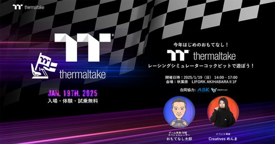 弊社取り扱いメーカーであるThermaltake社は、2025年1月19日(日)、東京・LIFORK AKIHABARA IIにおいて、レーシングシミュレーターゲームの楽しさをご紹介するスペシャルイベント「今年はじめのおもてなし!Thermaltakeのレーシングシミュレーターコックピットで遊ぼう!」を開催いたします。