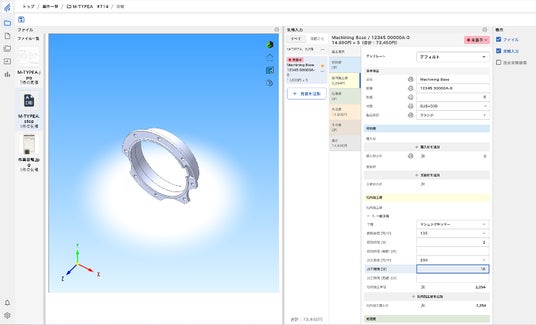 また、格納した3D CADデータを閲覧しながら、見積の作成や類似図面検索ができるようになります。これにより、3D CADのみで見積依頼が来るケースや、複雑な形状で3D CADの参照が必要なケースで、シームレスな見積作成業務が可能となります。