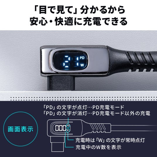 シリコンケーブルを採用し、W数表示機能付きで映像出力にも対応しているUSB Type-CケーブルのL字コネクタタイプ