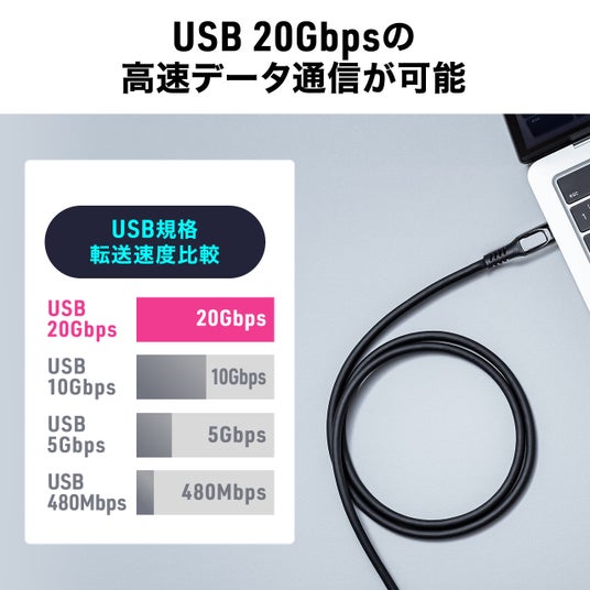 PD100W対応で、ノートパソコンやタブレットを高速充電可能。また、20GbpsのUSB4規格により、データ転送も高速化。大容量データのやり取りや複数デバイスの充電が、この1本でスムーズに完結します。