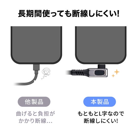L字型コネクタの採用により、デスク周りや車内といった狭いスペースでの使い勝手が向上。配線がスッキリし、コネクタ部分の負担も軽減します。モバイルデバイスを頻繁に使う方に最適な設計です。