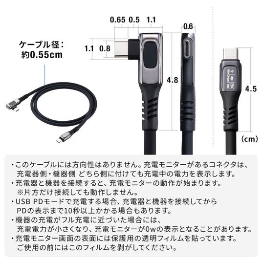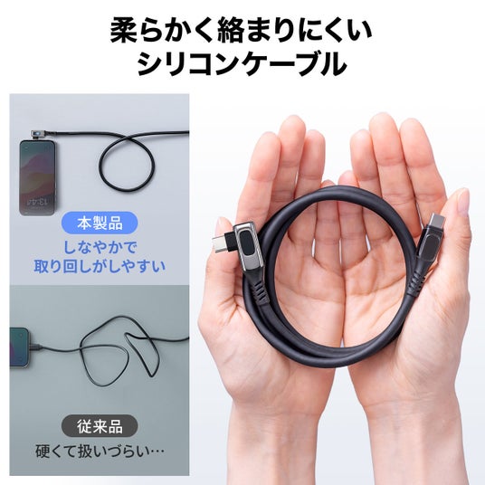 USB Type-Cケーブル W数表示機能付き USB4 8K/60Hz L字コネクタ 映像伝達可能 PD100W対応 1m シリコンケーブル 充電 データ転送 スマホ タブレット