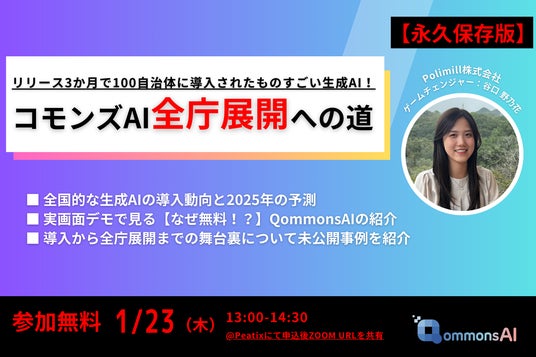 生成AIの社会実装をリードするICTスタートアップ、Polimill株式会社(本社:東京都港区、代表取締役:横田えり)は、省庁・自治体向け生成AI「QommonsAI(コモンズAI)」の導入や活用事例をテーマにした無料オンラインセミナーを2025年1月23日(木)に開催いたします。