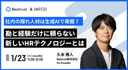 Beatrust株式会社(本社:東京都港区、代表取締役:原邦雄、以下、Beatrust)と、ジャフコ グループ株式会社(本社:東京都港区、取締役社長:三好啓介、以下、JAFCO)は、本年1月23日(木)11時より「社内の隠れ人材は生成AIで発掘? ~勘と経験だけに頼らない新しいHRテクノロジーとは~」をテーマに無料オンラインセミナーを開催します。