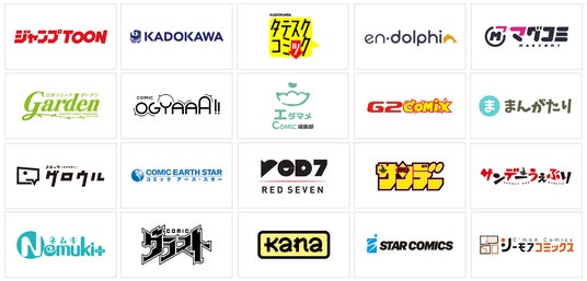 ジャンプTOON、KADOKAWA、TATESC COMICS、エンドルフィン、マグコミ、月刊コミックガーデン、コミックオギャー!!、エダマメCOMIC、ジーツーコミックス、まんがたり、コミックグロウル、コミック アース・スター、レッドセブン、少年サンデー、サンデーうぇぶり、Nemuki+、comicグラスト、Kana、Star Comics、シーモアコミックス