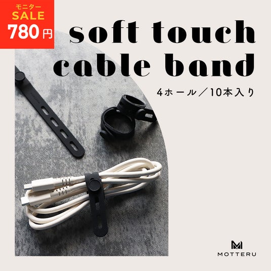 sofumo ソフトタッチ ケーブルバンド(MOT-CBBAND05)細いケーブルから太いケーブルまでしっかりと固定できるケーブルバンドです。従来のパッケージの素材からプラスチック使用量を削減し、紙素材のシンプルなパッケージを採用しました。