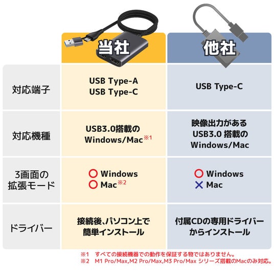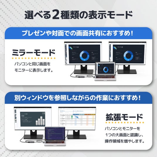 映像出力機能が無いUSBポートからでも出力が可能です。2台とも同じ画面を出力するミラーモード、それぞれの画面に映し出す拡張モードに対応。Windows10,11/Mac OS 10.15に対応。