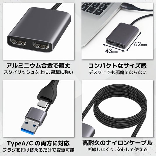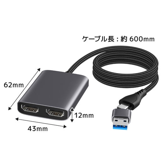 幅43×奥行62×高さ12mm/約60g。本体には2つのHDMIポートを搭載。USB(Type-C/Type-A)にてパソコンと接続。USBポートからHDMIで2台のモニターに出力することが可能。
