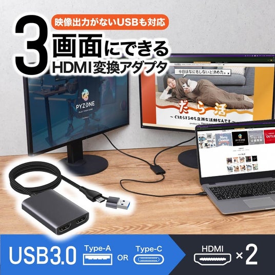 『映像出力がないUSBでも3画面にできるHDMI変換アダプタ』を1月10日に発売いたしました。