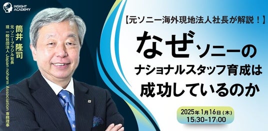 本セミナーでは、ソニーで数多くの海外ビジネス現場を経験し、22年に及ぶ駐在員生活で海外販売会社の社長を歴任した筒井氏が、ソニーがどのようにしてナショナルスタッフ育成を成功させ、グローバル企業としての成長を遂げたのか、その秘訣を解説します!