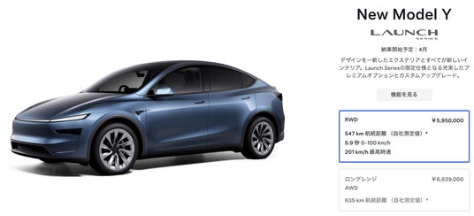 Model Y RWD:547km(自社測定値) 201km/h(最高速度) 5.9秒(0-100km/h)