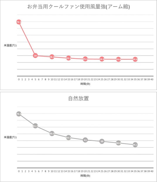 お弁当用クールファンを使用した場合、開始5分で一気に約30度まで粗熱を取ることが可能!