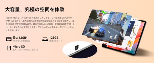 Teclast P30Tで、より高い効率を実現しましょう!これは高速なLPDDR4X RAM 4GBを誇り、最大8GBまでの仮想メモリ拡張を提供し、最大12GBのRAMを実現します。1TBのMicro SDカード容量拡張をサポートし、ニーズに合わせて軽々とステップについていくストレージソリューションを提供します。