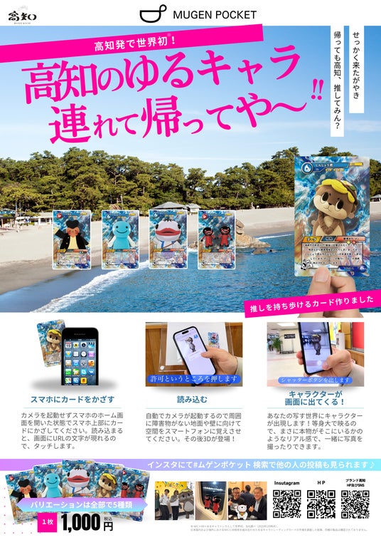 株式会社ブランド高知(所在地: 高知県高知市北本町4-2-33-701、代表取締役社長: 中島匠一)は、2025年1月より、観光地や宿泊施設での体験をAR(拡張現実)技術で彩る革新的な商品「MUGEN POCKET CARD(ムゲンポケットカード)」を発売します。本カードは、高知県の人気ゆるキャラをテーマにしたデザインで、スマートフォンをかざすだけでキャラクターが現実世界に登場する次世代型体験を提供します。