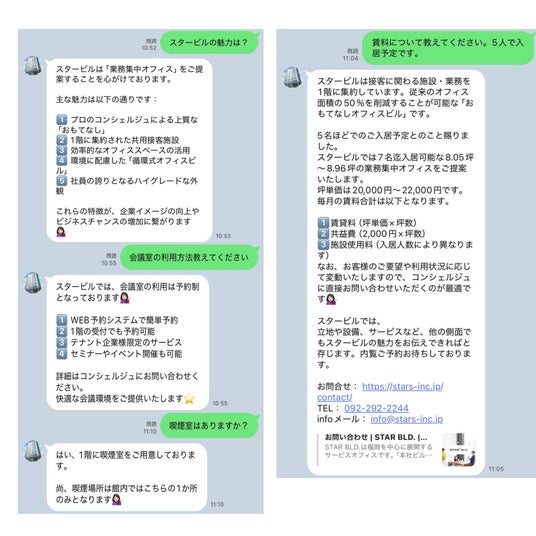 入居前サポート: AIが入居を検討する企業に、スタービルの特徴やサービスをリアルタイムで詳しく説明し、スムーズな意思決定をサポートします。