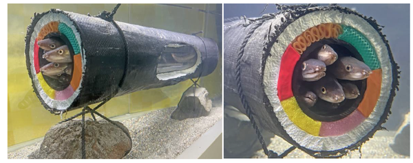節分にその年の恵方を向いて無言で食べるのが良いとされる恵方巻。アナゴはこの巻物の代表的な具材の一つとして知られ、暗く狭い場所を好む性質を持つ。今回の展示では、恵方巻を模した筒を水槽に設置し、アナゴが自ら筒に入る様子を観察できる。筒の一部は透明になっており、その中でぎっしりと詰まるアナゴたちの姿を見ることができる。