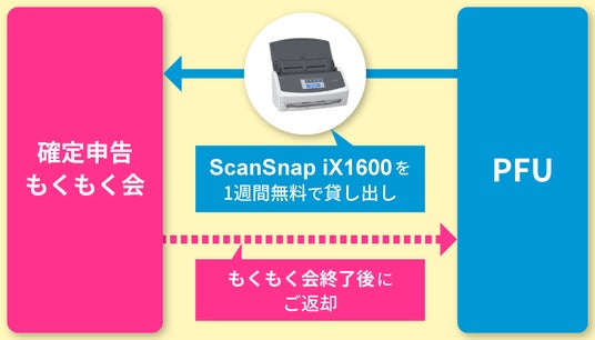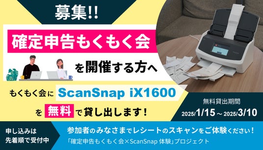 株式会社PFU(社長執行役員:村上 清治、以下 PFU)は、1月15日から3月10日 まで、全国各地のオフラインで開催される「もくもく会」にイメージスキャナーScanSnap iX1600を、1週間無料貸し出しを実施する、「確定申告もくもく会×ScanSnap体験プロジェクト(以下、本プロジェクト)」を開始します(台数限定、先着順)。