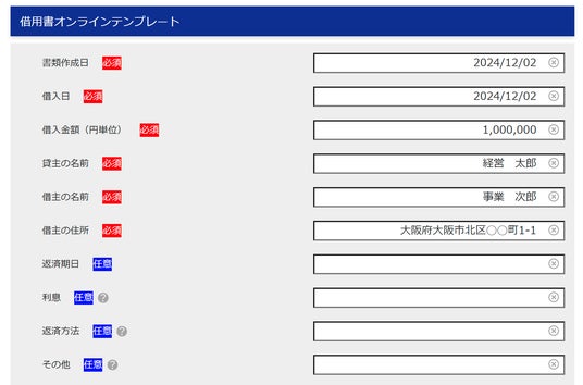 借用書をオンラインテンプレートで作成する際は、書類作成日や借入日、借主と貸主の情報など必須事項をフォームに沿って入力します。