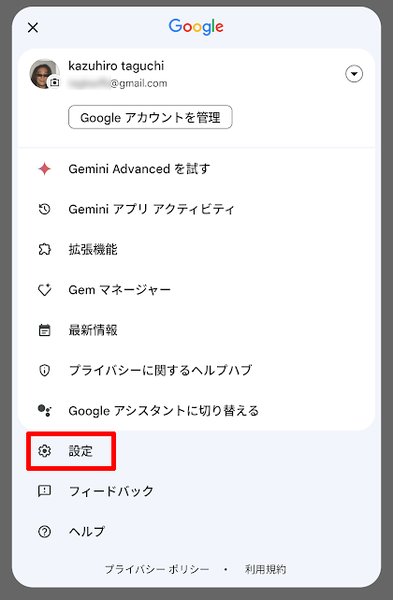 なお、Geminiの設定を変更したい場合は、通常のテキストモードの状態で画面右上に表示されているGoogleアカウントのアイコンをタップ。