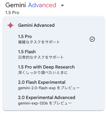 2.0 Experimental Advanced:「Gemini 2.0」のAdvancedバージョンの先行体験版。将来的にGemini Advancedの主力モデルになると予想されている。