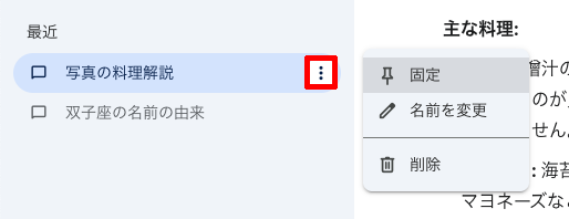過去のチャットも記録されており、「⁝」をクリックしてリストの一番上に「固定」したり、名前を変更することもできる。後で見返す可能性があるものはわかりやすい名前に変更しておくといいだろう。