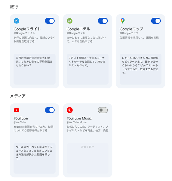 デフォルトでは「Googleフライト」「Googleホテル」「Googleマップ」「Youtube」が有効になっている。
