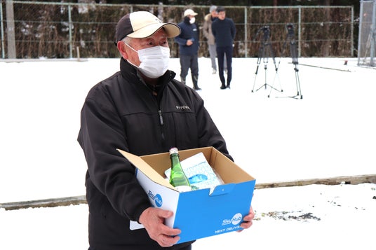 ドローン配送された岩泉ヨーグルトと日本酒を受け取る中山さん(松ケ沢公民館)