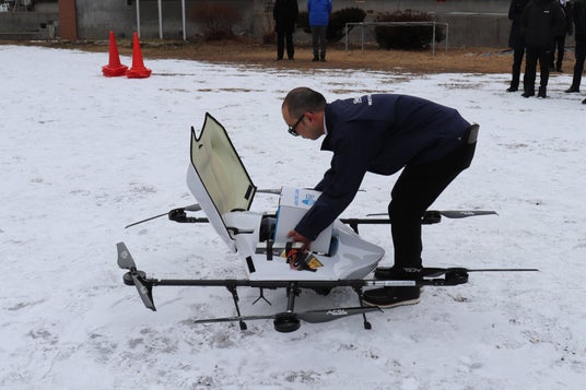 物流専用ドローン“AirTruck”に岩泉ヨーグルトや日本酒を入れた専用箱を搭載(旧安家小学校)