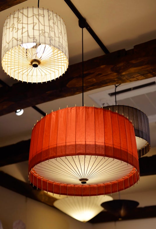 京和傘を160年以上継承する日吉屋が手掛ける、和傘の技術とデザインが光る和傘照明が、伝統工芸品を美しく照らします。※店内の和傘照明もお取り寄せ購入頂けます。