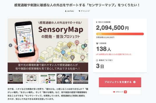 感覚過敏の人々の外出をサポートするウェブ版センサリーマップ開発のためのクラウドファンディングが目標金額200万円を達成