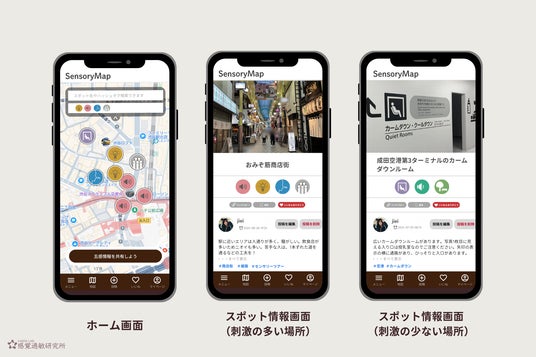 今回、私たちは、ウェブ上の広域マップに「さわがしい場所」「まぶしい場所」「ニオイのある場所」といった刺激のある場所や、「静かな場所」「カームダウンスペース」といった落ち着ける場所の情報を、ユーザーが口コミや評価を通して情報を共有できるマップの開発を進めています。