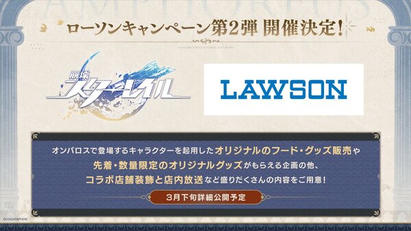 全国のローソンでスターレイルキャンペーン第2弾が開催決定。オンパロスで登場するキャラクターたちを起用したオリジナルのフードやグッズ販売、先着・数量限定のオリジナルグッズがもらえる企画のほか、コラボ店舗装飾と店内放送など盛りだくさんの内容を用意している。詳細は3月下旬に公開予定なので、開拓者は期待して待とう。