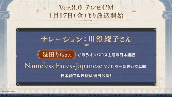 Ver.3.0のテレビCMが2025年1月17日より放映開始。CMはオンパロス編とマダム・ヘルタ編の2本となっており、ナレーションは声優の川澄綾子さんが担当。さらにCMでは、先日公開されたシンガーソングライターでありYOASOBIのボーカルikuraとしても活躍する幾田りらさんが歌うオンパロスの主題歌「Nameless Faces」の日本語バージョンを使用している。楽しみにしよう。