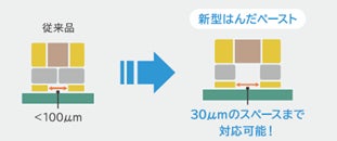 新型はんだペーストは、特殊設計された高分子樹脂で金属粒子をサポートしているため、通常のはんだペーストと比べ、高い絶縁性、接着性、安定性を有しています。よって、はんだ付け工程において、基板に新型はんだペーストを印刷してはんだ付けをする場合も、加熱で樹脂がはんだを保護し、歩留まりが高い状態で導通することが可能です。