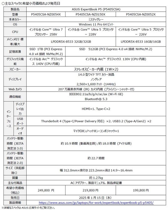 「ASUS ExpertBook P5 (P5405CSA)」は、本日2025年1月15日(水)より発売を開始します。