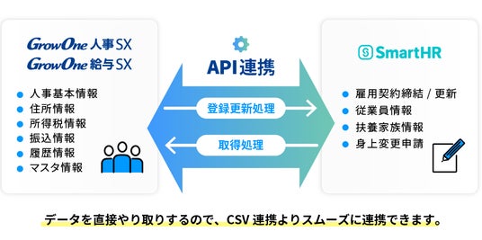 今回の API 連携により、「GrowOne 人事 SX/給与 SX」と「SmartHR」に登録された人事情報を相互に連携できます。これにより、従来はそれぞれのシステムに個別に入力していた人事情報の⼆重管理が不要となり、 業務の効率化を図れます。