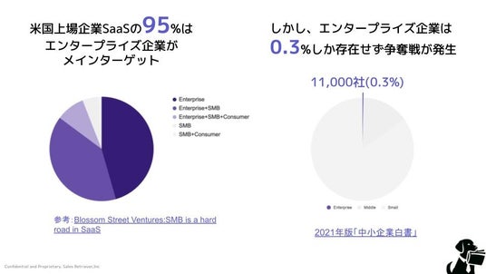 BtoBサービスを提供している企業の多くは、顧客単価が大きくなりやすいエンタープライズ企業との商談機会や受注を求めています。米国でも上場企業SaaSの95%はエンタープライズ企業をメインターゲットとしているという実態があります(※1)。