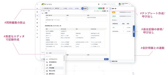 - 診療記録をより自由に、より使いやすく。高機能エディタの搭載により、文字情報にとどまらず、「見出し」「表」「チェックリスト」「区切り線」「箇条書き」など、多彩な表現が可能。また、検査データ、明細情報、過去の診療記録とも連動し、一元管理をスムーズに。
