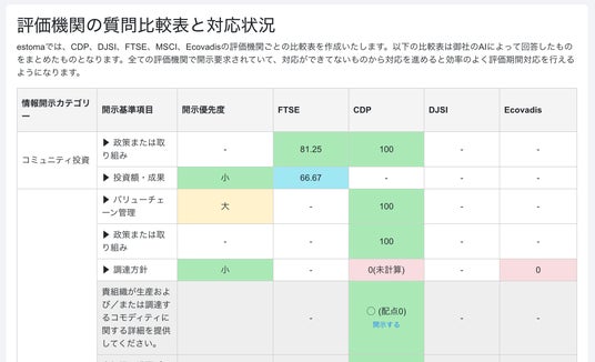 estoma AIの今回の新機能では、評価機関ごとの質問を全て解析し、質問の比較表と自社のサステナビリティの各項目への対応状況をまとめました。