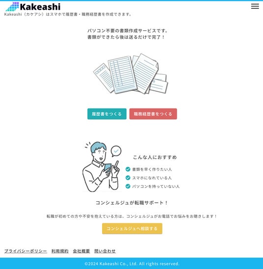 「Kakeashi」サービスサイト:スマホやパソコンで簡単に履歴書や職務経歴書を作成できるウェブサービス「Kakeashi」