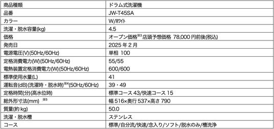 4.5kgドラム式洗濯機 (JW-T45SA)の概要は以下の通りです。