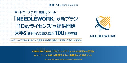 株式会社エーピーコミュニケーションズ(本社:東京都千代田区、代表取締役:内田武志、以下「当社」)は、この度、ネットワークテスト・ポリシーテスト自動化ツール「NEEDLEWORK(ニードルワーク)」の新プラン「1Dayライセンス」の提供を開始しました。さらに、売上や導入数も順調に伸びており、2025年1月時点で導入数は100社を突破しました。