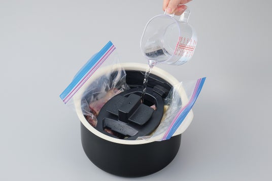 ジッパーつき食品保存袋※5 で調理ができるパック調理専用のホルダーが付属しています。調味料と食材を袋に入れ、パックホルダーにセットすることで、同時に最大2品調理※4 できます。主食から副菜まで同時に調理できるので、手間なく