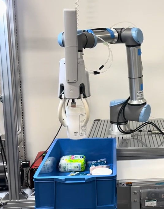 扱う製品のサイズや種類、重量がさまざま かつ SKUが多様で事前画像登録が不可能といったピースピッキングの自動化に向けた課題を解決するソリューション。事前学習なしに不特定多数の対象物をピック。ブリヂストン製新型ロボットハンド「TETOTE and」を活用、吸着パッドと4爪が対象物を把持・搬送、取り漏れを防ぐ。