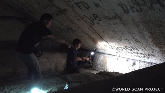 ピラミッド内部の調査の様子と、解析データを用いた映像